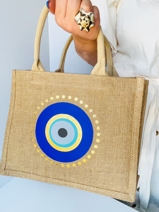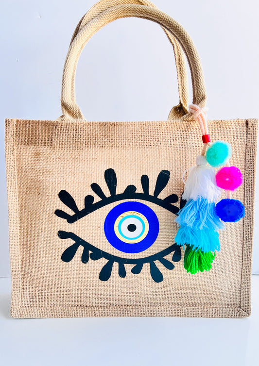 Hamsa Hand Evil Eye Burlap Tote Bag