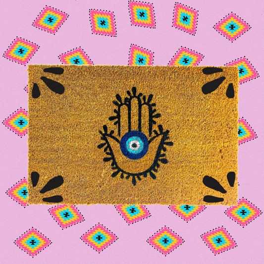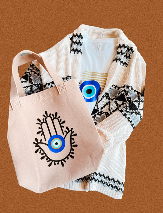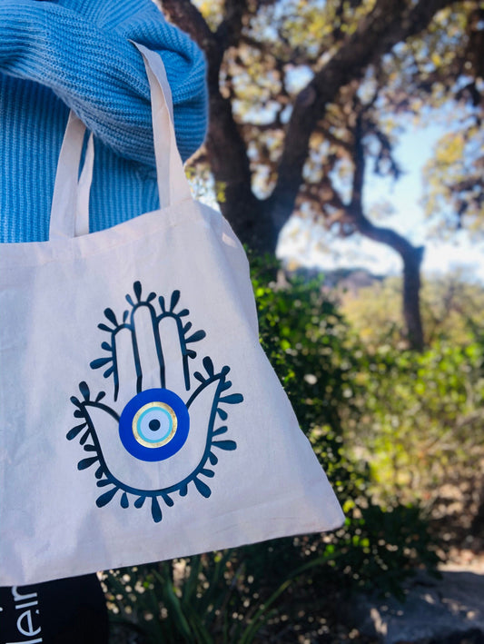 Evil Eye Design Hamsa Hand Tote Bag Handmade Natural Color
