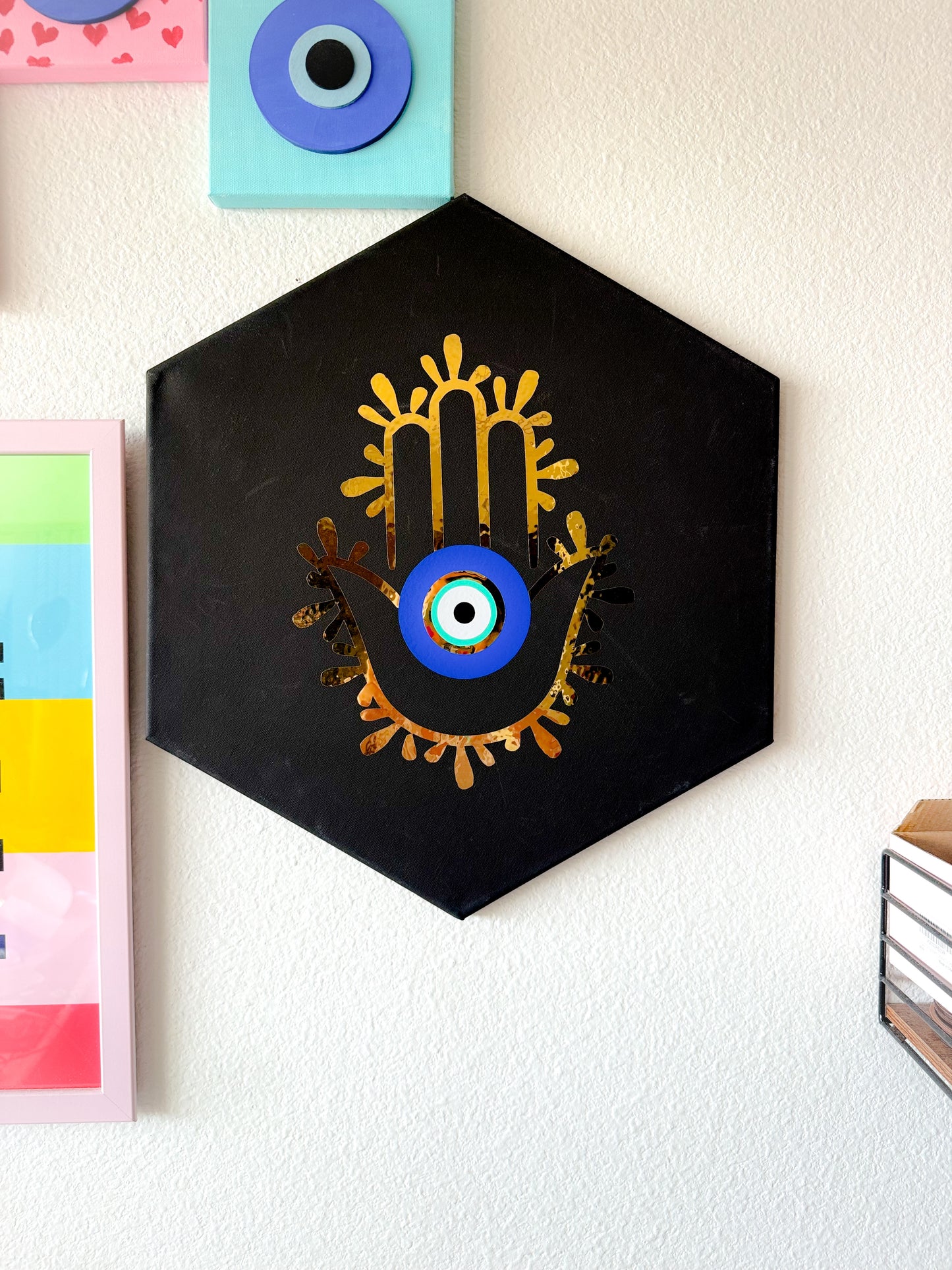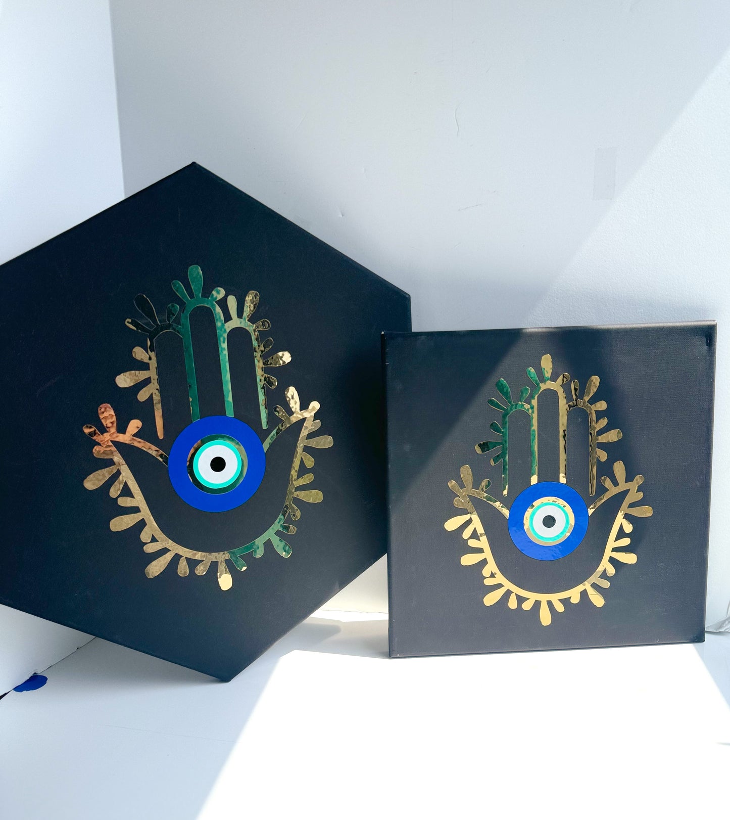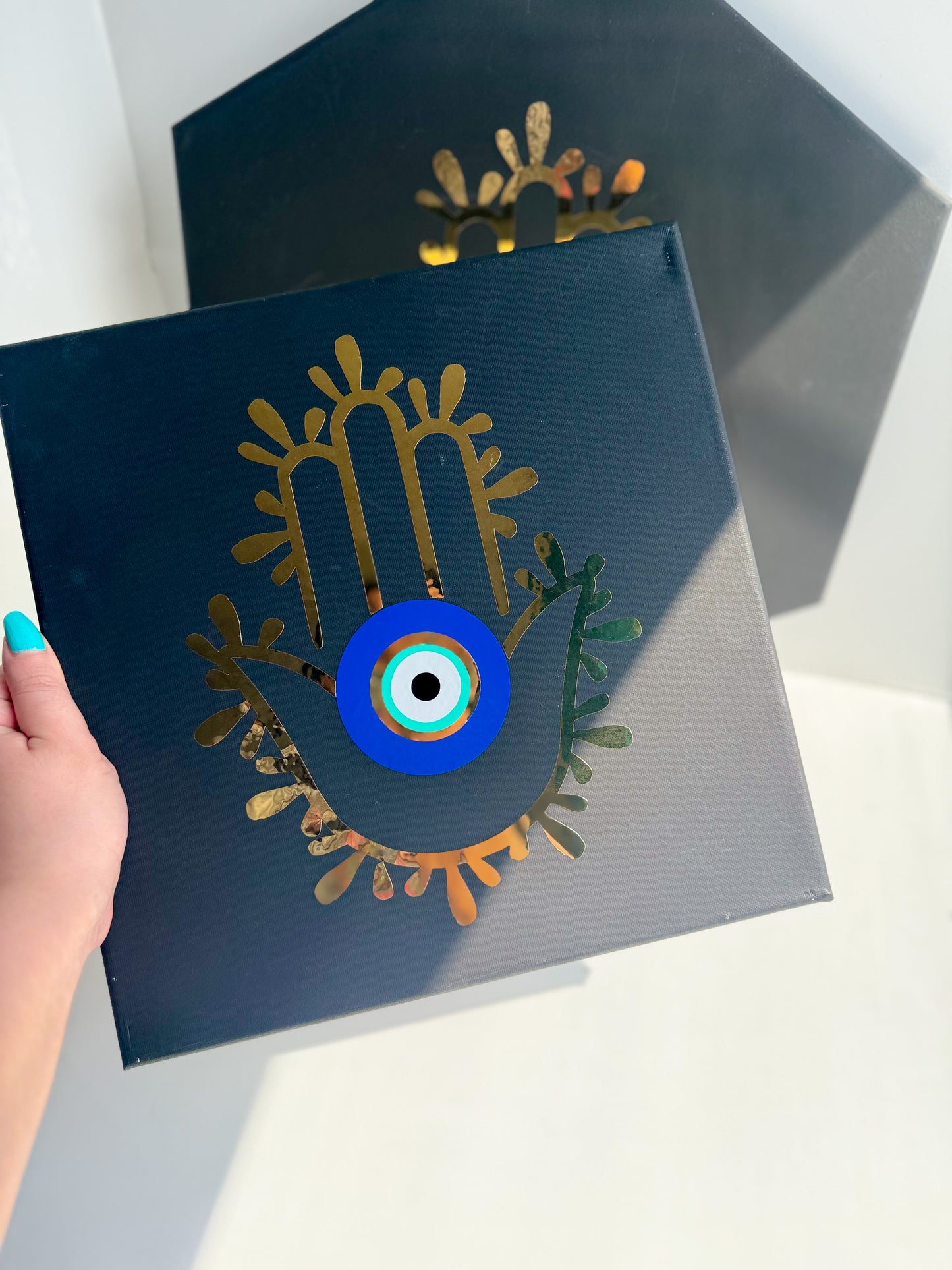 Enhance your space with the unique and protective energy of our Amida Hamsa canvas art, meticulously designed and crafted by hand. This stunning piece features a gold vinyl overlay on a high-quality canvas, showcasing an intricate Hamsa hand adorned with the traditional Evil Eye.