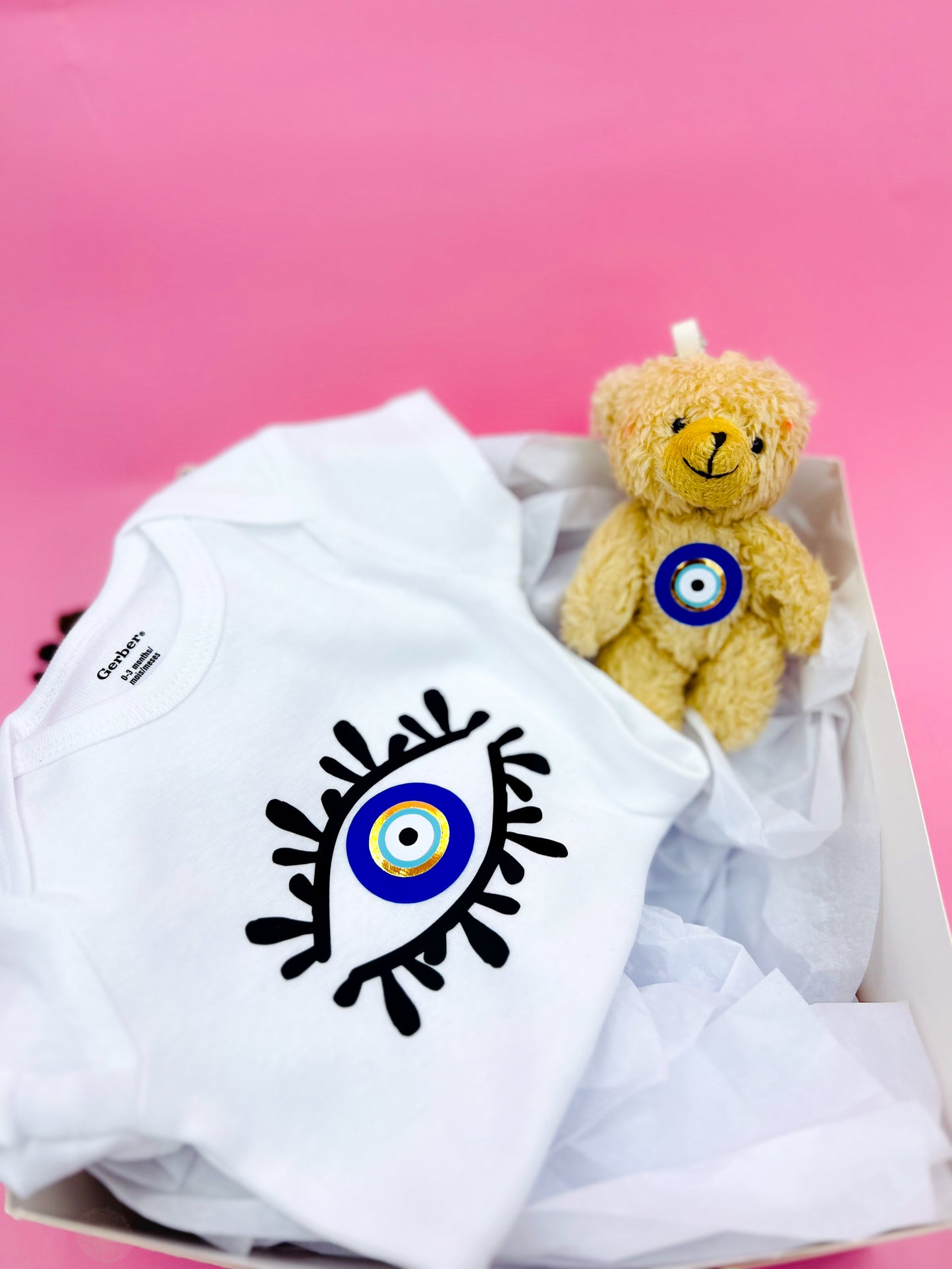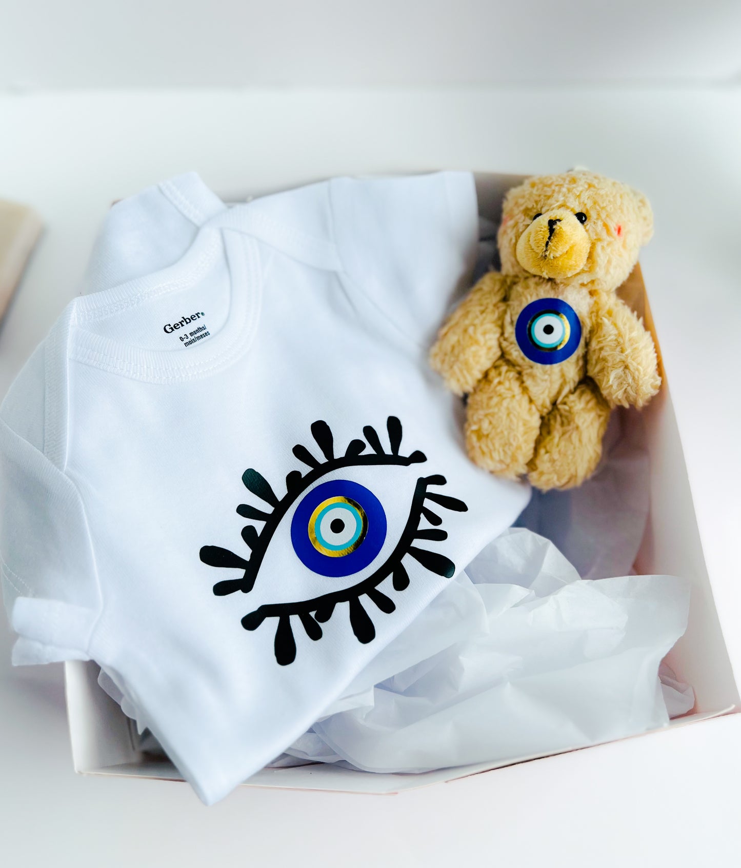 This sweet set is the perfect gift for babies. Organic cotton onesie and teddy bear ornaments!