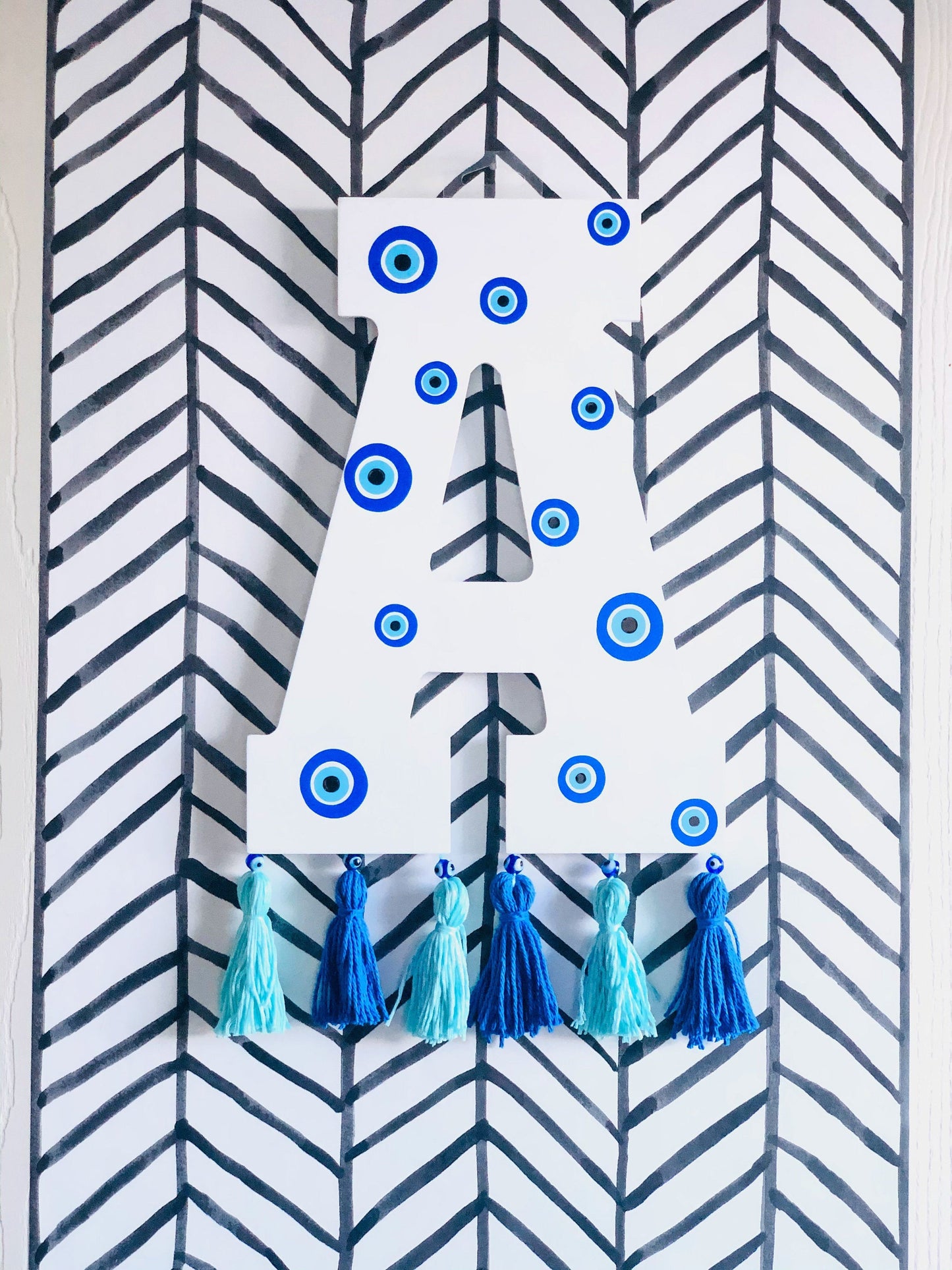 All wall letter decors are wood and you can be hanging on the wall, door, or your kid's room. Large evil eye decor for your home.