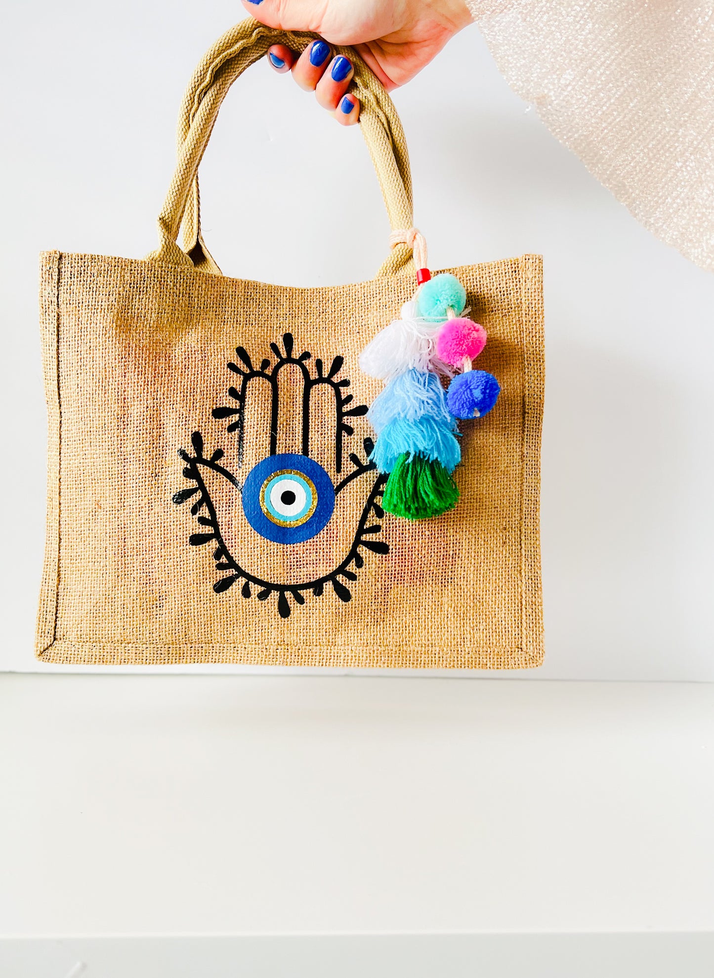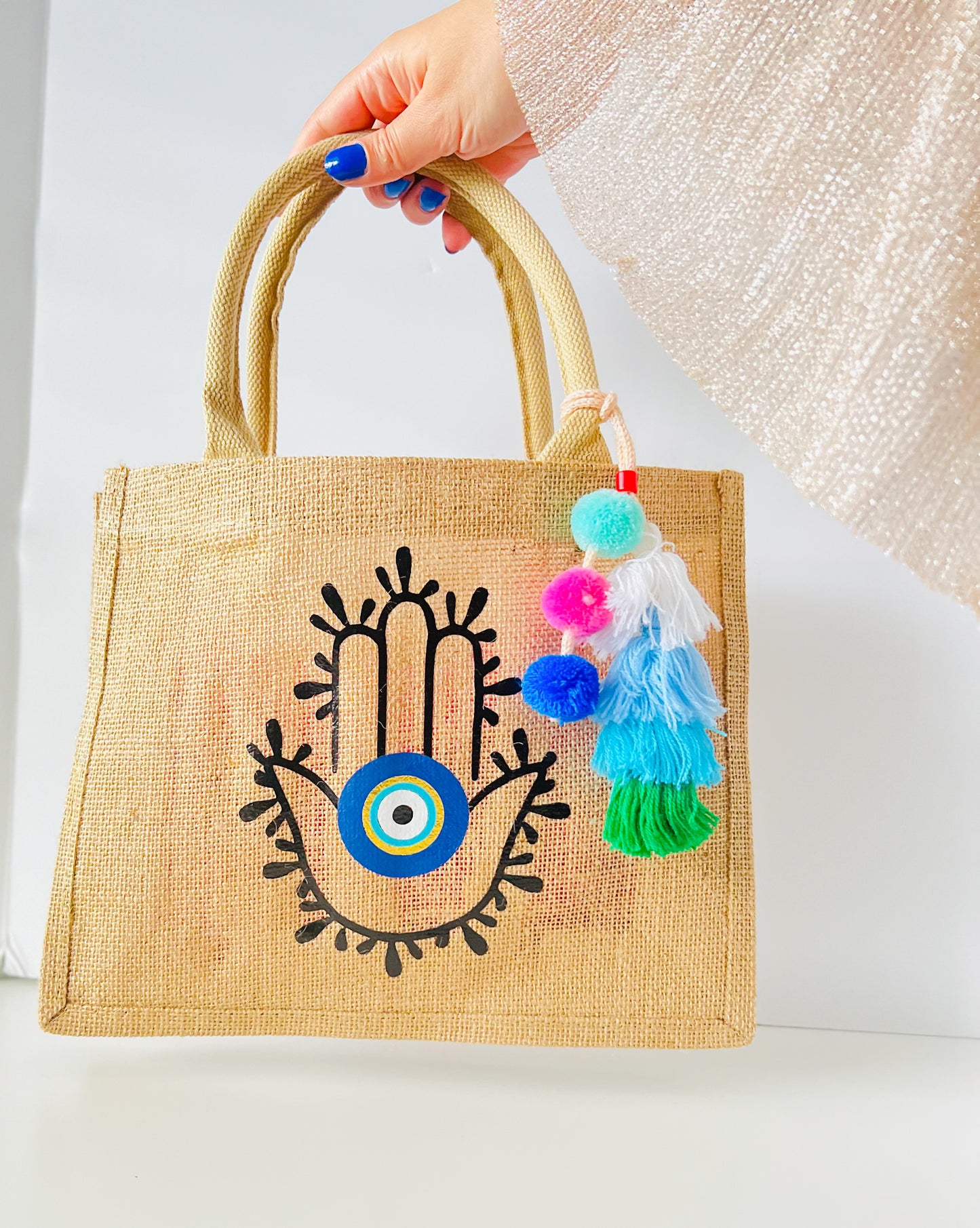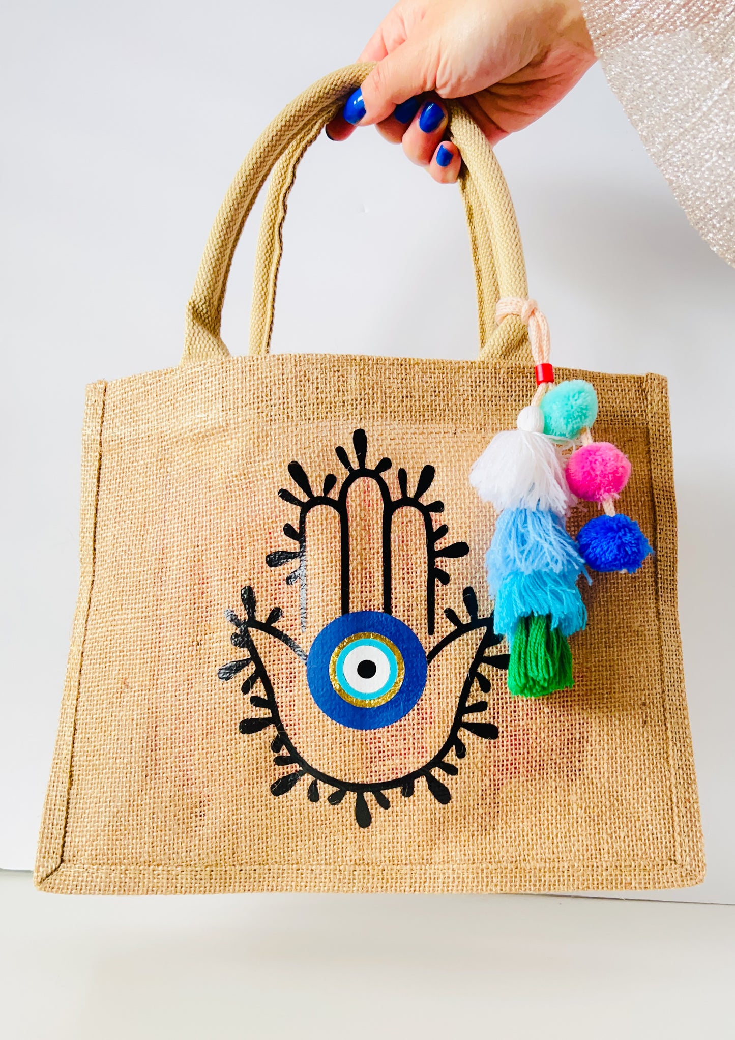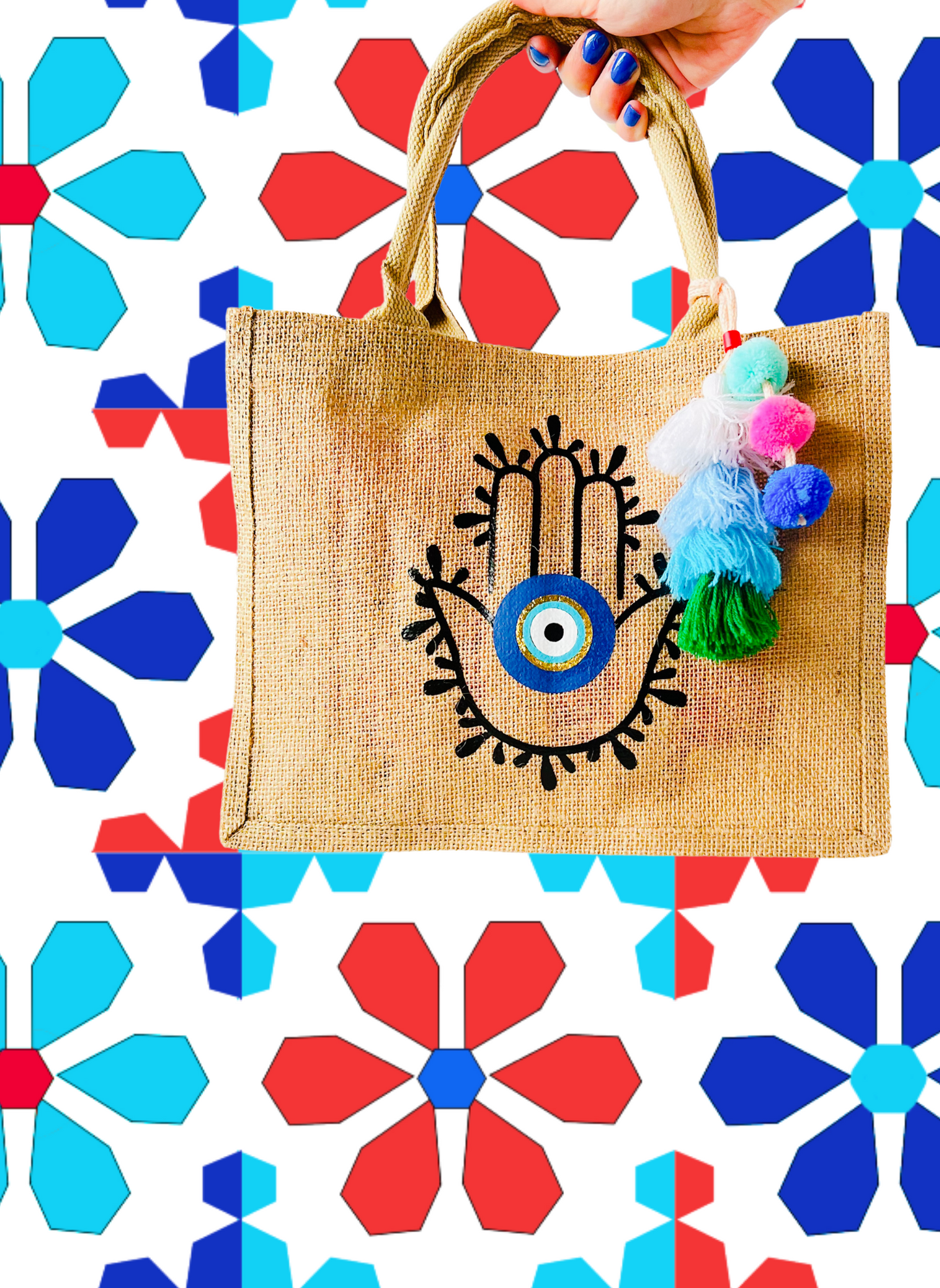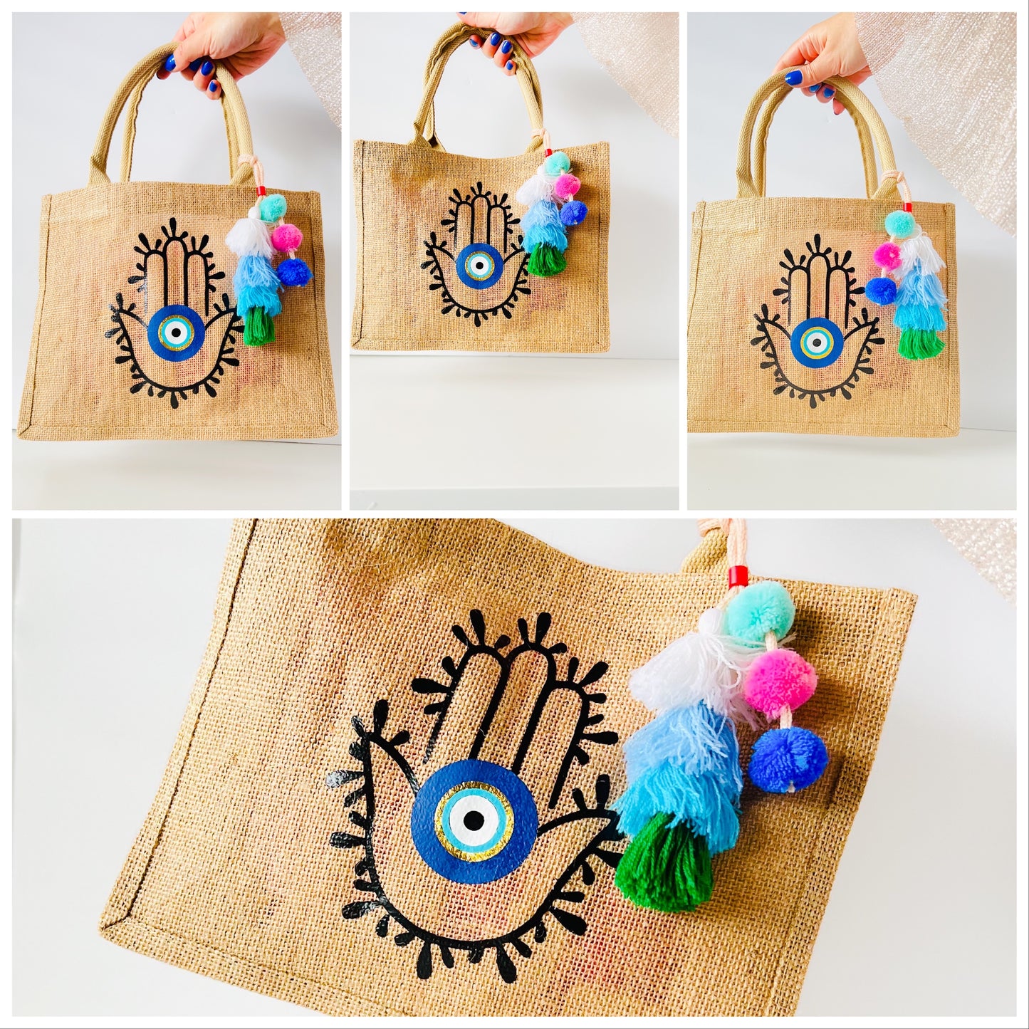 Hamsa Hand Evil Eye Burlap Tote Bag