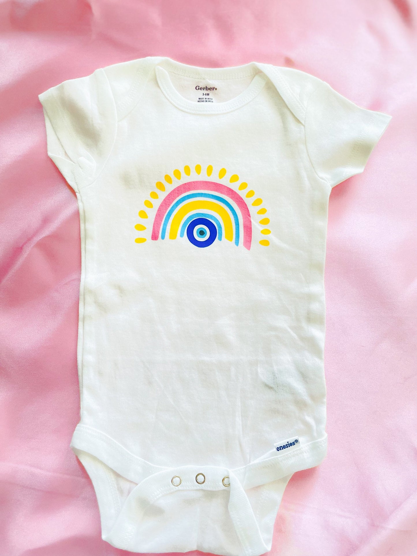 You can customize the gift set by including the baby's name on the box or onesie - just provide the details in the personalization field. The onesie, hat and mittens come in standard sizes ranging from 0-6m.