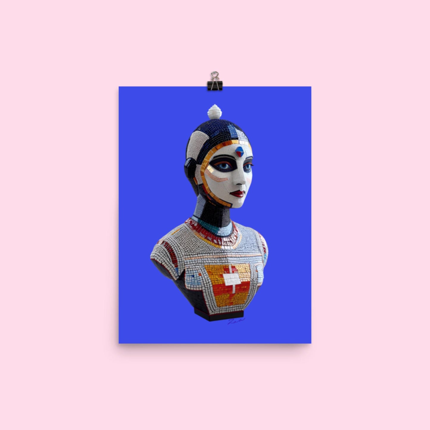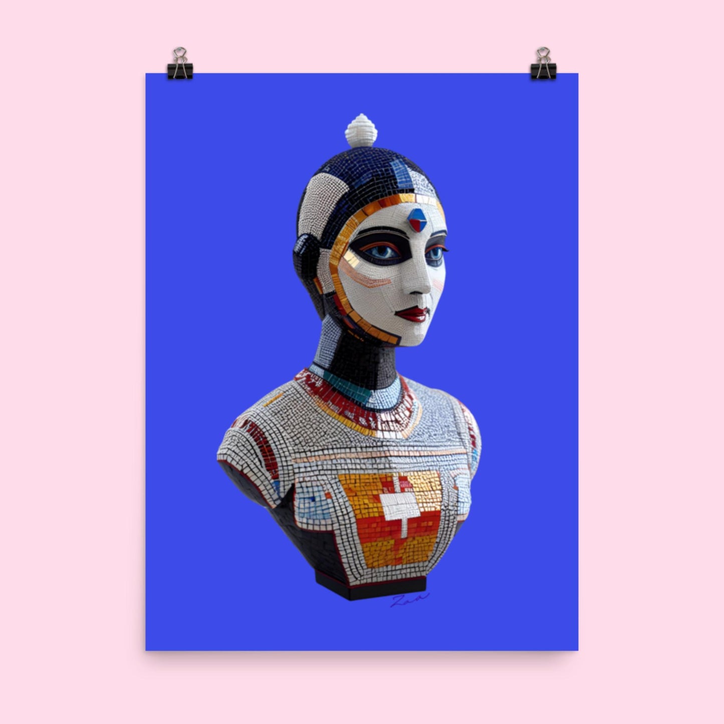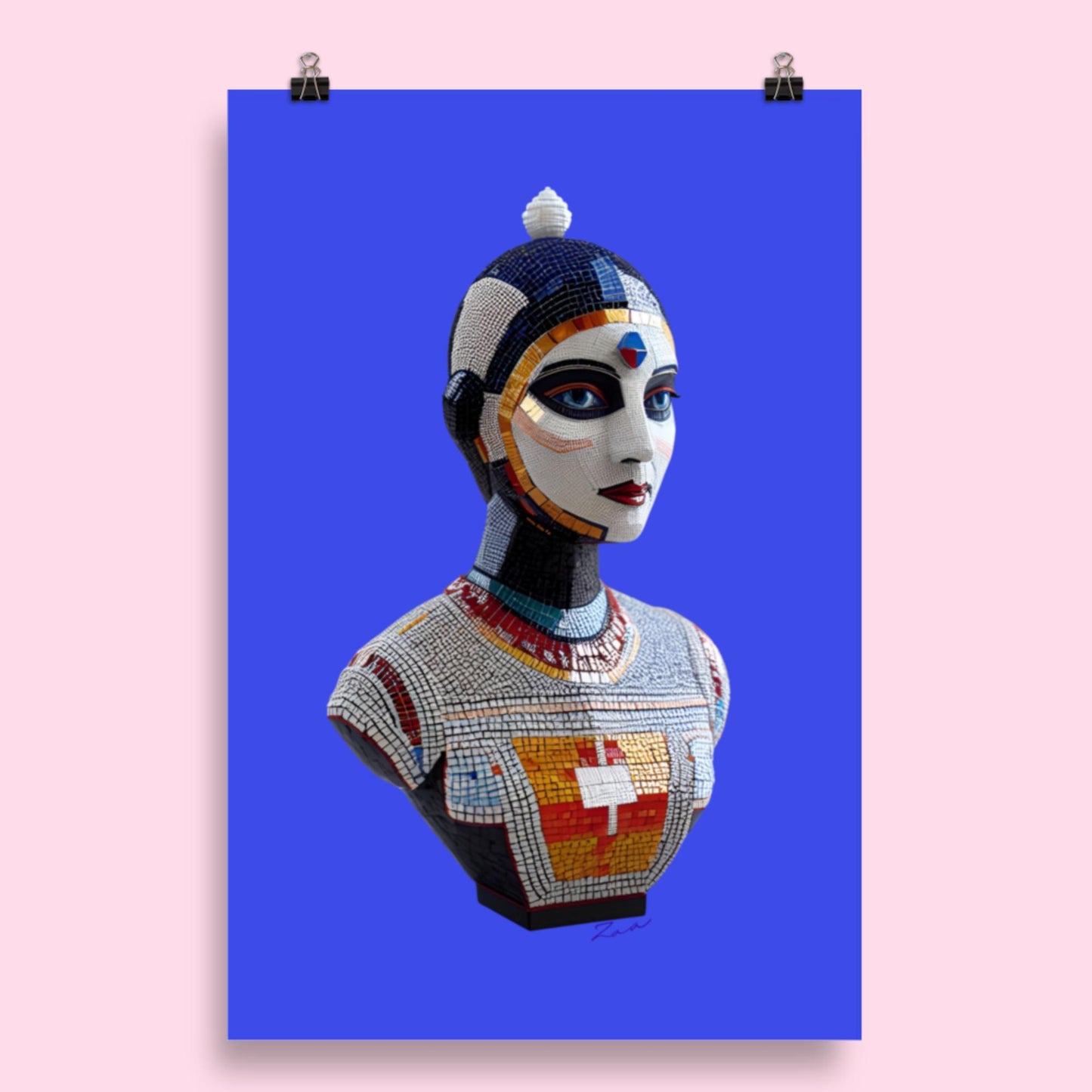 Designed by Amida By Zaa© This inspiring poster features a beautiful mosaic of an ancient Mesopotamian woman, capturing her strength and grace in vibrant detail.